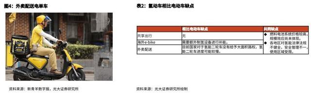 3、外賣配送:B端高頻次使用,性能更好。氫能二輪車在外賣配送等場景具有使用壽命長、補能速度快、續(xù)航里程長、安全性好等優(yōu)勢。電動車使用壽命2~3年,氫動車可達3年以上。氫動車加氫時間較短,且換氫僅需數(shù)秒,電動車充電需要幾小時。一輛氫能二輪車燃料電池系統(tǒng)僅2~3kg,電動車48V30Ah鋰電池約10kg;對應(yīng)電動二輪車普遍續(xù)航里程70-90km,氫動車同類型可達100km。(后文外賣領(lǐng)域采用48V30Ah的鋰電、鉛酸電池與500W,2.4L燃料電池氣態(tài)儲氫瓶對比)