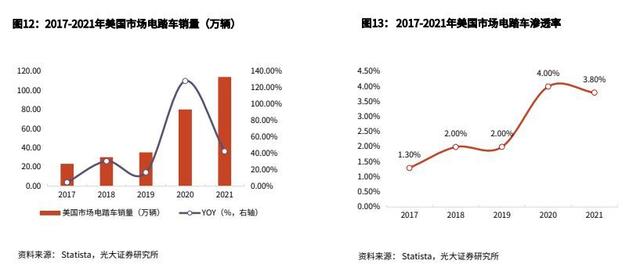 美國市場起步較晚,客戶群體主要為運動愛好者和極限發(fā)燒友。2020年以來,受疫情催化及政策推動,更多消費者選擇電踏車以滿足其通勤及休閑需求,客戶群體進一步擴大。2021年美國電踏車銷量114萬輛,同比增長40.7%,滲透率提升至3.8%。從美國政府提出的一系列稅收抵免、通勤津貼、關(guān)稅暫緩的政策,以及美國市場目前較低的滲透率來看,未來美國市場仍具有很大發(fā)展?jié)摿Α?/p>
