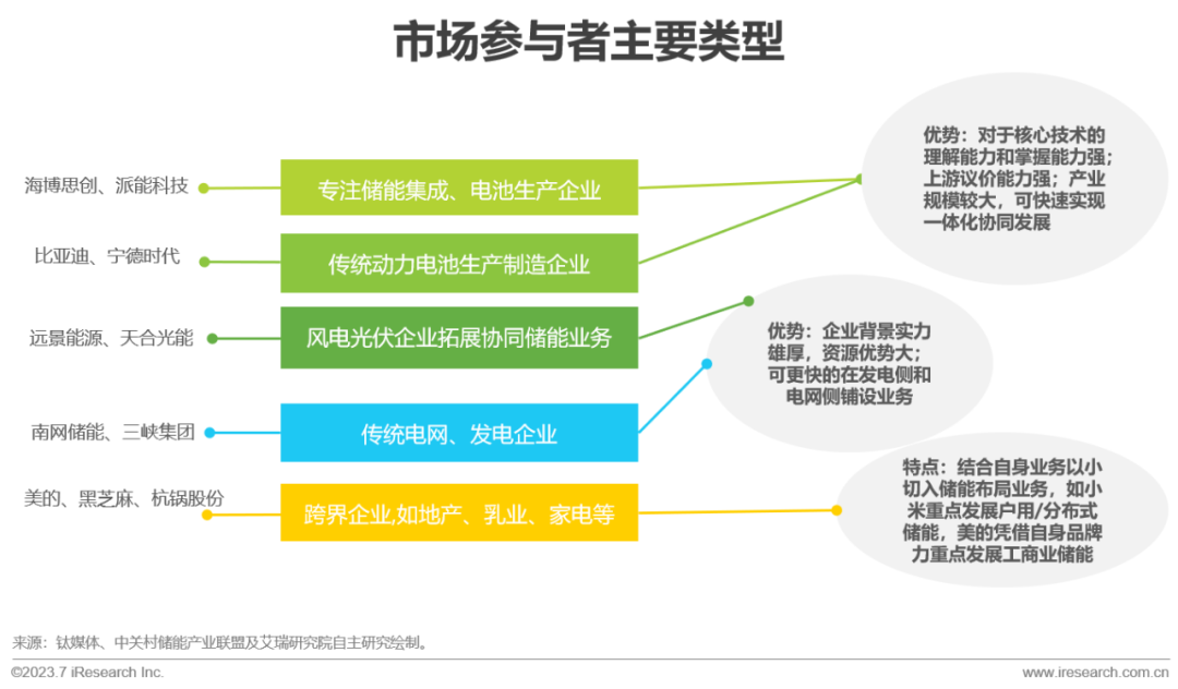 新能源的火熱帶動了儲能產(chǎn)業(yè)的快速發(fā)展,盡管儲能仍處于產(chǎn)業(yè)發(fā)展初期階段,商業(yè)模式和市場格局仍未定局。但市場已涌現(xiàn)各式參與者瓜分“蛋糕”。從動力電池廠商到食品互聯(lián)網(wǎng)企業(yè)跨界參與,市場玩家不斷涌入。市場參與者各有優(yōu)勢。針對儲能行業(yè)發(fā)展正處于供需端適配過程。