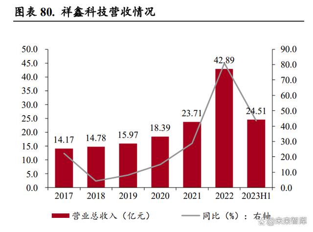 公司營(yíng)收增長(zhǎng)迅速,新能源、儲(chǔ)能精密沖壓模具及金屬結(jié)構(gòu)件貢獻(xiàn)營(yíng)收逐年增加。公司營(yíng)業(yè)收入從 2017 年的 14.17 億元增加到 2022 年的 42.89 億元,年均復(fù)合增長(zhǎng)率達(dá)到 24.80%,2023 年上半年實(shí)現(xiàn)營(yíng)業(yè)收入 24.51 億元,同比增長(zhǎng) 43.38%。分產(chǎn)品來看,2019 年以來新能源汽車零部件和儲(chǔ)能設(shè)備 結(jié)構(gòu)件業(yè)務(wù)占總營(yíng)收比例明顯提升,其中 2022 年新能源汽車產(chǎn)品收入占比達(dá) 59.62%,成為公司主 要的收入來源,給公司帶來新的收入增長(zhǎng)點(diǎn)。
