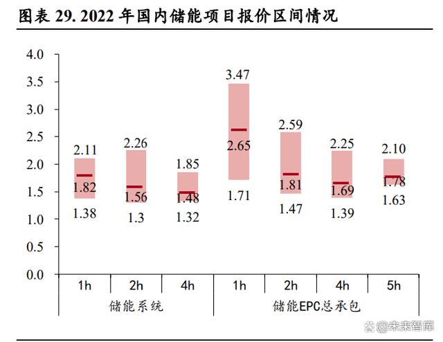 儲(chǔ)能系統(tǒng)投標(biāo)價(jià)格持續(xù)下行,刺激需求釋放。根據(jù)儲(chǔ)能與電力市場(chǎng)公眾號(hào)的統(tǒng)計(jì),2022 年招標(biāo)的近 150個(gè)儲(chǔ)能項(xiàng)目中,2h 的儲(chǔ)能系統(tǒng)占比達(dá) 63%,平均報(bào)價(jià) 1.56 元/Wh;儲(chǔ)能 EPC 總承包招標(biāo)的近 120 個(gè)項(xiàng)目中,2h 的 EPC 項(xiàng)目占比達(dá) 77%,平均報(bào)價(jià) 1.81 元/Wh。從時(shí)間維度上來看,2022 年儲(chǔ)能系 統(tǒng)報(bào)價(jià)呈現(xiàn)出了“兩頭高中間低”的特點(diǎn),并且從 5 月起持續(xù)穩(wěn)定在 1.5-1.6 元/kWh 的范圍之內(nèi), 而進(jìn)入 2023 年之后,隨著電芯主要原材料碳酸鋰價(jià)格的進(jìn)入下行通道,儲(chǔ)能系統(tǒng)報(bào)價(jià)屢創(chuàng)新低,2023 年 7 月份 2 小時(shí)儲(chǔ)能系統(tǒng)的平均報(bào)價(jià)為 1.12 元/Wh,同比下降 28.24%,環(huán)比下降 0.88%,最低報(bào)價(jià) 低至 1.00 元/Wh,而 4 小時(shí)儲(chǔ)能系統(tǒng)最低報(bào)價(jià)低至 0.87 元/Wh。儲(chǔ)能系統(tǒng)價(jià)格的快速下降,將有力 提升大儲(chǔ)項(xiàng)目業(yè)主方的投資積極性,推動(dòng)項(xiàng)目的建設(shè)進(jìn)程。