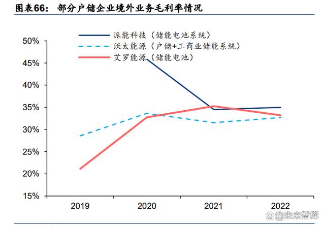 對(duì)比成熟的家電行業(yè):我們選取發(fā)展相對(duì)比較成熟的家電行業(yè)進(jìn)行對(duì)比,家電企業(yè)做境外 業(yè)務(wù)主要有出口自有品牌、海外并購(gòu)、ODM/OBM/OEM 代工三種模式。我們通過(guò)對(duì)比發(fā)現(xiàn), 選擇自有品牌模式的樂(lè)歌股份、安克創(chuàng)新、石頭科技、星徽股份能夠在境外獲得更高的毛 利率,我們計(jì)算四家企業(yè) 2018-2022 年境外與境內(nèi)的毛利率差值均值為 10.65pct。同時(shí), 由于能夠選擇以自有品牌打海外市場(chǎng)的公司產(chǎn)品具有較強(qiáng)的產(chǎn)品力,其整體毛利率通常也 處于較高水平。戶(hù)儲(chǔ)產(chǎn)品在一定程度上具有家電屬性,國(guó)內(nèi)儲(chǔ)能產(chǎn)業(yè)鏈發(fā)展國(guó)際領(lǐng)先,具 有強(qiáng)產(chǎn)品力與品牌力,隨著后續(xù)行業(yè)競(jìng)爭(zhēng)加劇,我們認(rèn)為穩(wěn)態(tài)下戶(hù)儲(chǔ)行業(yè)優(yōu)質(zhì)企業(yè)仍能夠 維持高出國(guó)內(nèi)市場(chǎng)平均 5 個(gè)百分點(diǎn)以上的毛利率水平。
