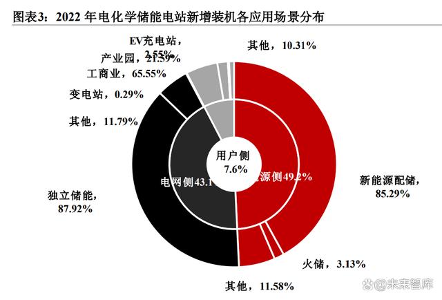 主要場景包括工商業(yè)、產業(yè)園、EV充電站、港口岸電、其他海島/校園/社區(qū)等。儲能裝置在用電低谷時充電,在用電高峰時放電,利用高峰和低谷的電價差,節(jié)省用電費用,從中可獲取經濟效益,因此戶用儲能主要集中在高電價及高電價差的國家或地區(qū)。國內用戶側以工商業(yè)儲能(占比65.55%)為主,產業(yè)園儲能、EV充電站的占比也在逐漸提升,在新增裝機中占比21.59%、2.55%。