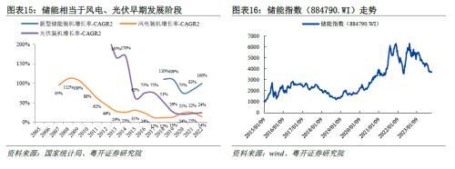 通過裝機增長率看儲能行業(yè)所處發(fā)展位置,當(dāng)前儲能裝機兩年復(fù)合增長率在00%上下,相當(dāng)于風(fēng)電、光伏行業(yè)發(fā)展早期。我們對儲能行業(yè)發(fā)展大勢的研判如下: