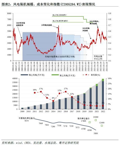 2008年底風(fēng)電指數(shù)底部回升,2010年底指數(shù)見頂,期間補貼政策發(fā)布;2011年后指數(shù)開啟下跌,于2012年末見底,期間風(fēng)電遭遇行業(yè)出清和嚴監(jiān)管;2013年指數(shù)緩慢反彈回升,2015年陸風(fēng)搶裝和市場大熱推動指數(shù)快速爬升,至2015年6月見頂;2015年下半年開始,指數(shù)震蕩下跌,并于2018年10月觸底反彈;2020和2021年連續(xù)兩年的搶裝使得風(fēng)電指數(shù)創(chuàng)新高,2021年11月指數(shù)見頂,雖在2022年有階段性行情表現(xiàn),但整體波動式下跌。