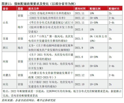 強制配儲政策客觀上拉動儲能裝機需求。2021年2月,國家發(fā)改委、能源局出臺《關(guān)于推進電力源網(wǎng)荷儲一體化和多能互補發(fā)展的指導(dǎo)意見》,明確增量風(fēng)光儲一體化要優(yōu)化配套儲能規(guī)模,充分發(fā)揮儲能調(diào)峰、調(diào)頻作用。5月出臺的《關(guān)于2021年風(fēng)電、光伏發(fā)電開發(fā)建設(shè)有關(guān)事項的通知》也指出保障性并網(wǎng)以外的項目,需通過自建、合建共享或購買服務(wù)等市場化方式落實并網(wǎng)條件后并網(wǎng)。自此,多地相繼發(fā)布電源側(cè)風(fēng)光強制配儲政策,多要求10%/2h的配置比例和時長,并且政策要求逐漸向15-30%和4-5h的高比例、長時儲能發(fā)展。事實上,多地風(fēng)光項目招標競爭過程中,實際配儲情況高于政策要求。