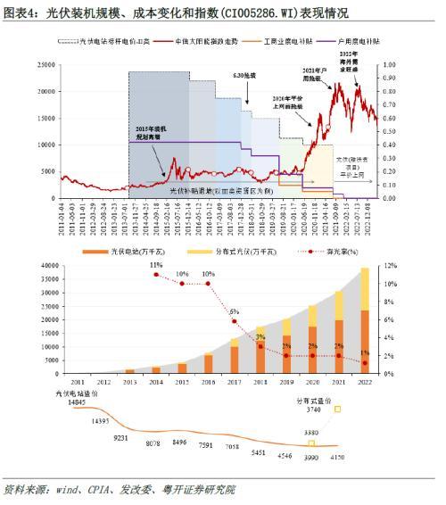 3、具體來看:1)風(fēng)電呈現(xiàn)周期性行情:三上漲與兩回調(diào)交錯,對應(yīng)行業(yè)擴張與嚴監(jiān)管交替。風(fēng)電周期性行情與行業(yè)供需均衡情況相匹配,行業(yè)快速擴張或增速放緩背后的原因在于政策引導(dǎo)或限制需求,復(fù)盤風(fēng)電發(fā)展和指數(shù)表現(xiàn),我們發(fā)現(xiàn)風(fēng)電行情周期大約在5年左右,每2-3年進行一次峰谷切換。2)光伏“四上一下”行情:規(guī)劃、補貼和需求是驅(qū)動因素。單復(fù)盤光伏指數(shù)走勢,光伏1-2年出現(xiàn)一波行情,但結(jié)合行業(yè)監(jiān)管和企業(yè)出清來看,光伏產(chǎn)業(yè)發(fā)展和行情周期仍為5年左右,期間受補貼退坡等事件驅(qū)動,指數(shù)出現(xiàn)階段性行情。