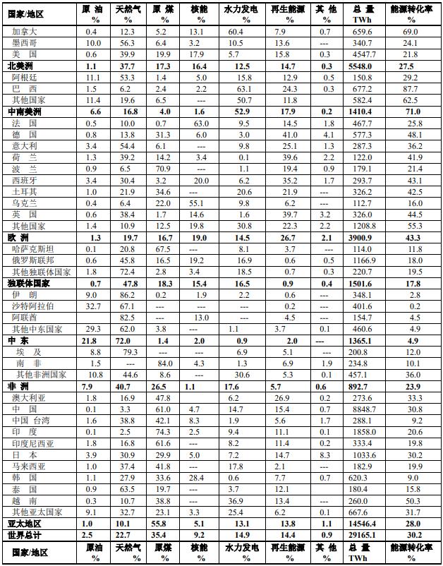 表1、 2022年世界各國(guó)電力結(jié)構(gòu)(以TWh表示)