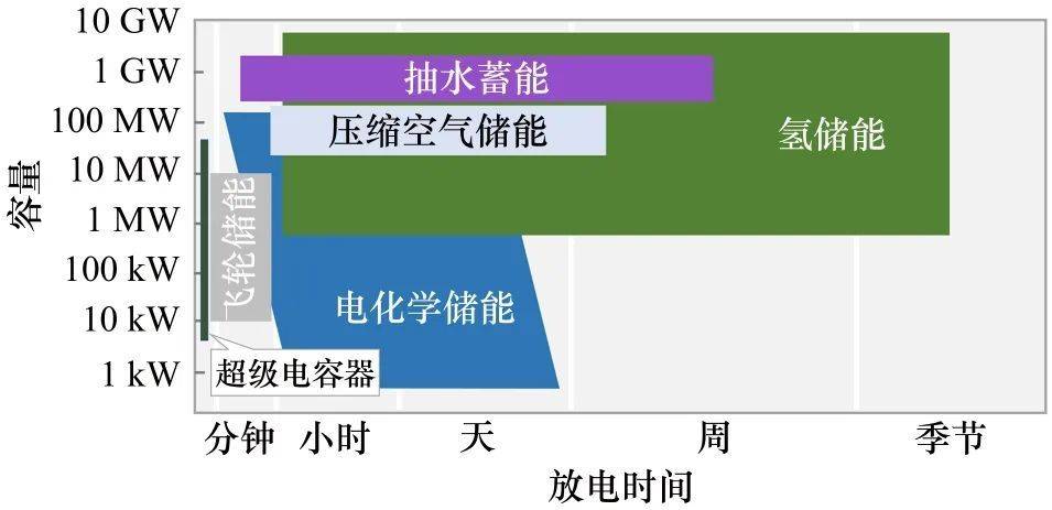 圖1 各類(lèi)儲(chǔ)能在放電時(shí)間和容量性能的對(duì)比