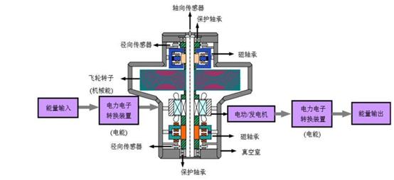 ——工作原理。飛輪儲(chǔ)能的原理是利用過剩電力給真空外殼中的轉(zhuǎn)子(飛輪)加速,把電能以動(dòng)能的形式儲(chǔ)存。在儲(chǔ)能階段,通過電動(dòng)機(jī)拖動(dòng)飛輪,使飛輪本體加速到一定的轉(zhuǎn)速,將電能轉(zhuǎn)化為動(dòng)能;在能量釋放階段,飛輪的旋轉(zhuǎn)速度會(huì)降低,電動(dòng)機(jī)作發(fā)電機(jī)運(yùn)行,將動(dòng)能轉(zhuǎn)化為電能。一般來(lái)說(shuō),飛輪系統(tǒng)使用電流來(lái)控制飛輪速度,其中高能的飛輪使用高強(qiáng)度碳纖維制成的轉(zhuǎn)子,并通過磁懸浮軸承實(shí)現(xiàn)懸浮。這些轉(zhuǎn)子在真空罩內(nèi)的轉(zhuǎn)速可達(dá)到20000-50000rpm,可以在幾分鐘內(nèi)達(dá)到所需的速度。