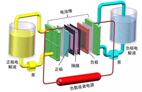 ——工作原理。液流電池通過離子選擇膜的離子交換將化學(xué)能轉(zhuǎn)化為電能,離子選擇膜將兩種液體電解質(zhì)分開存儲(chǔ)在不同的罐中,利用兩種化學(xué)溶液進(jìn)行離子交換來(lái)進(jìn)行充放電,其電壓一般在1.0-2.2V之間。與其它電池相似,液流電池的功率與隔膜面積成正比,而儲(chǔ)存能量的多寡和溶液儲(chǔ)存容量成正比。