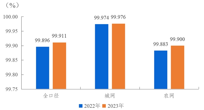 2023年,全國用戶平均供電可靠率99.911%,同比上升0.015個(gè)百分點(diǎn),其中,城網(wǎng)99.976%,農(nóng)網(wǎng)99.900%。城網(wǎng)與農(nóng)網(wǎng)相差0.076個(gè)百分點(diǎn)。